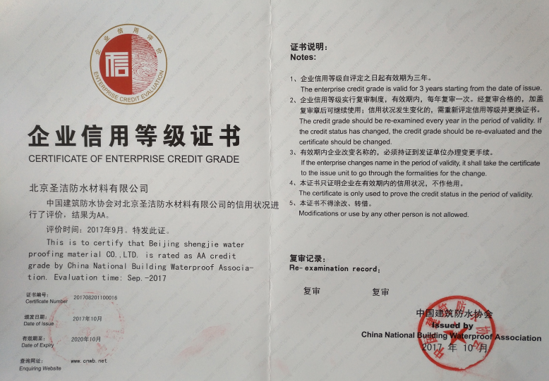 • AAAA建筑防水行業質量誠信評價證書
