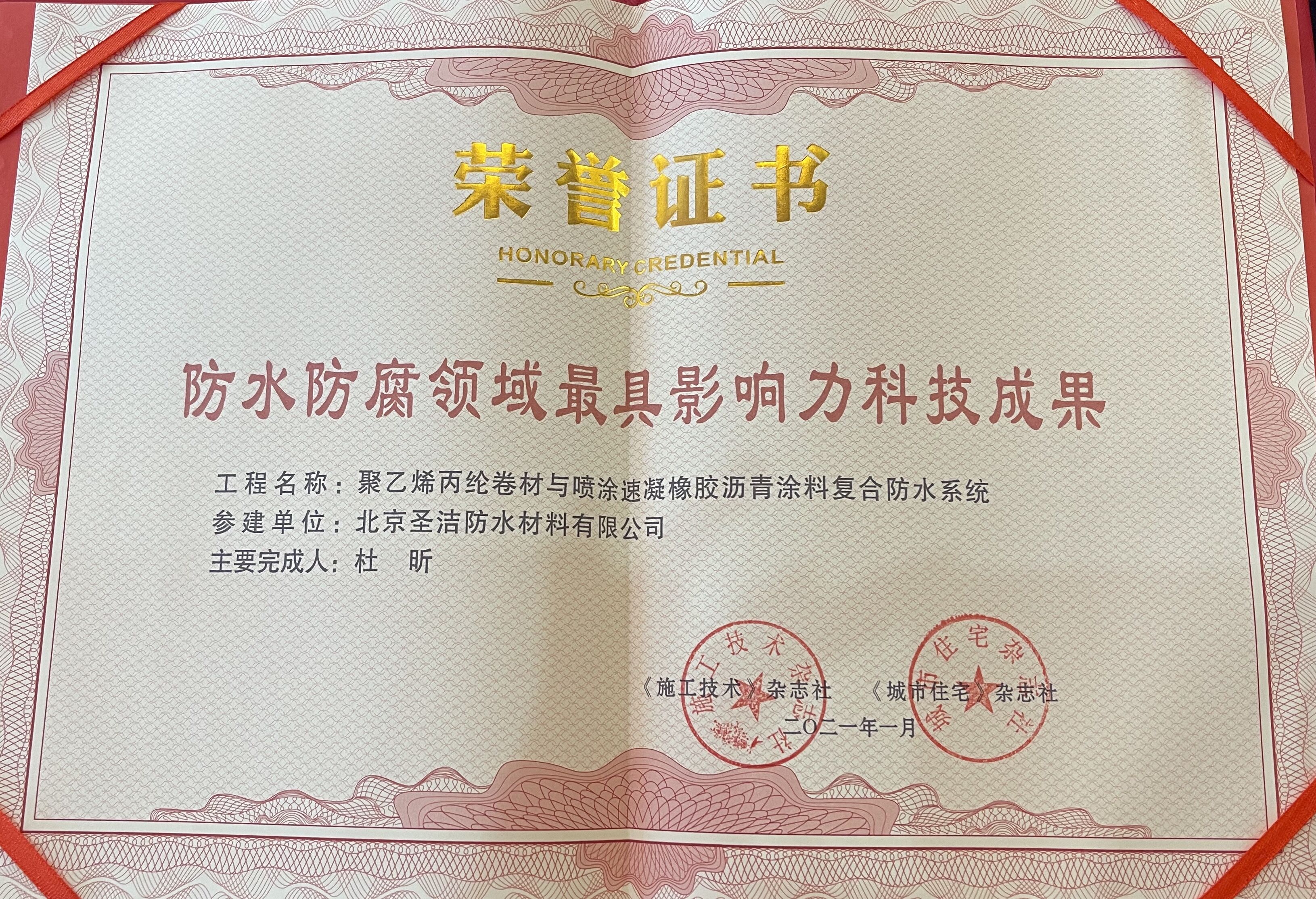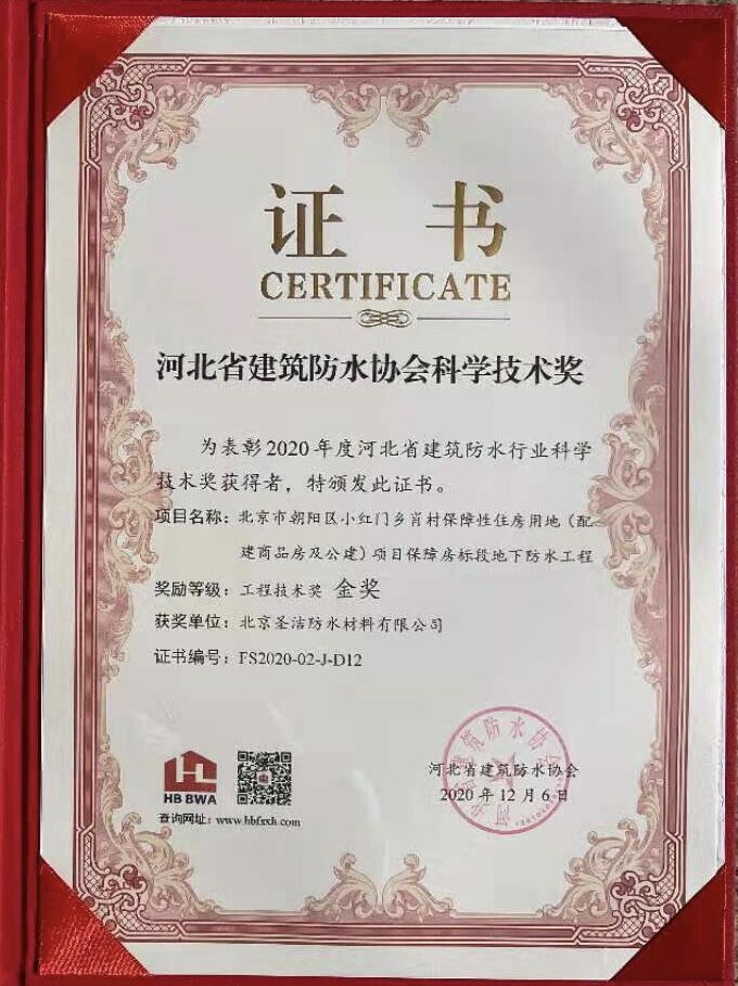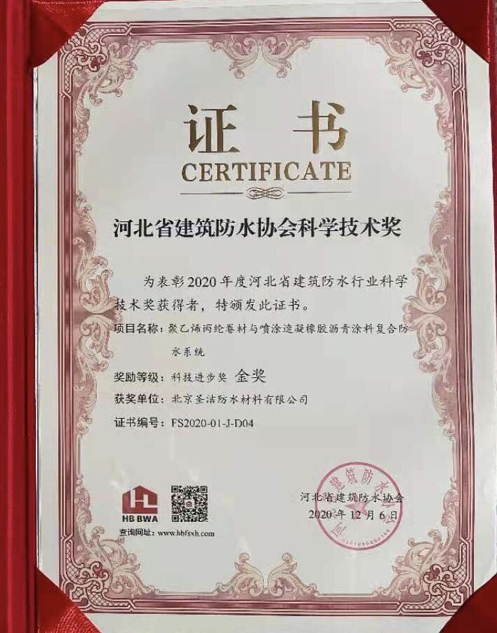 • “2020年度建筑防水行業科學技術獎——