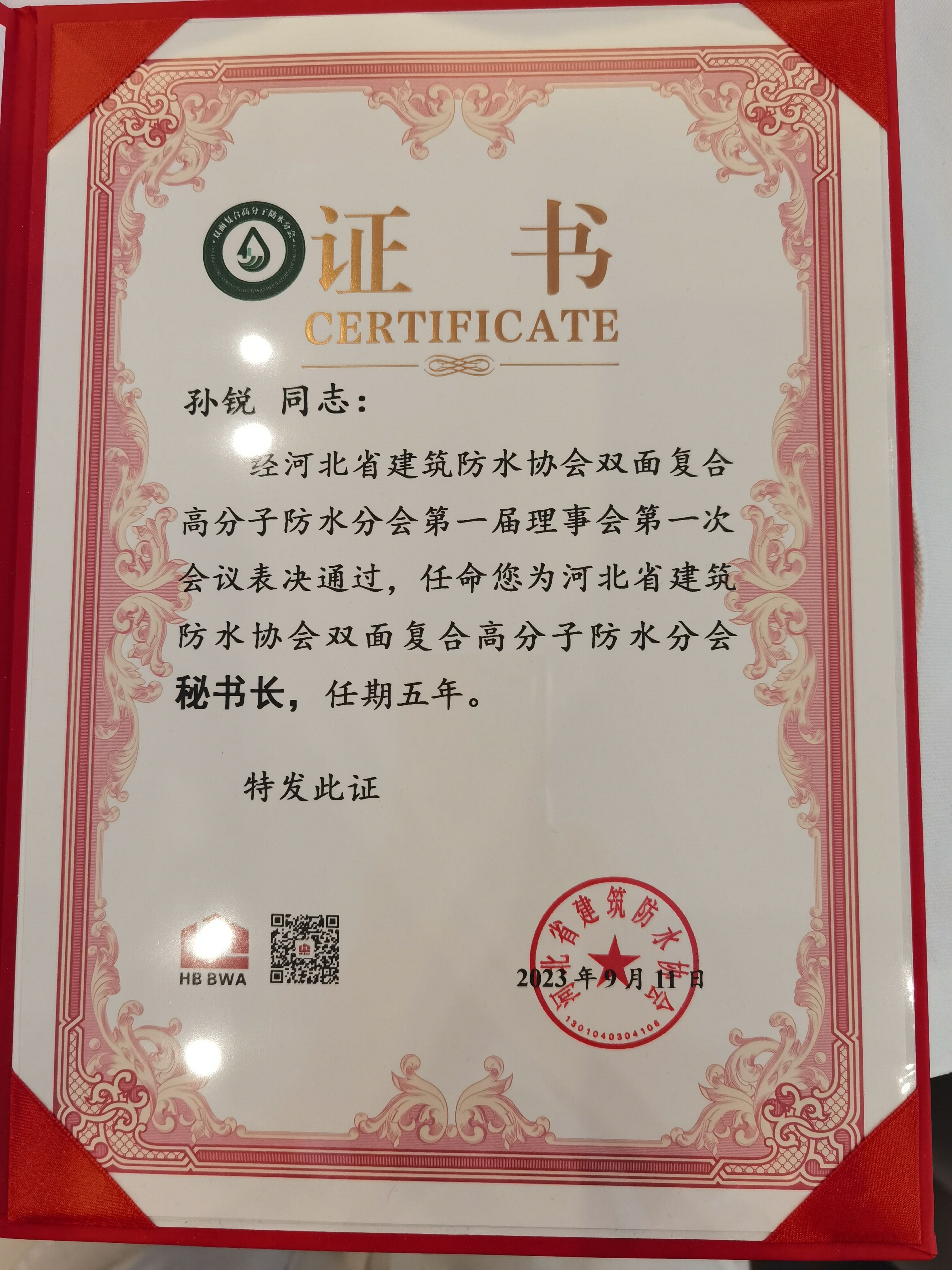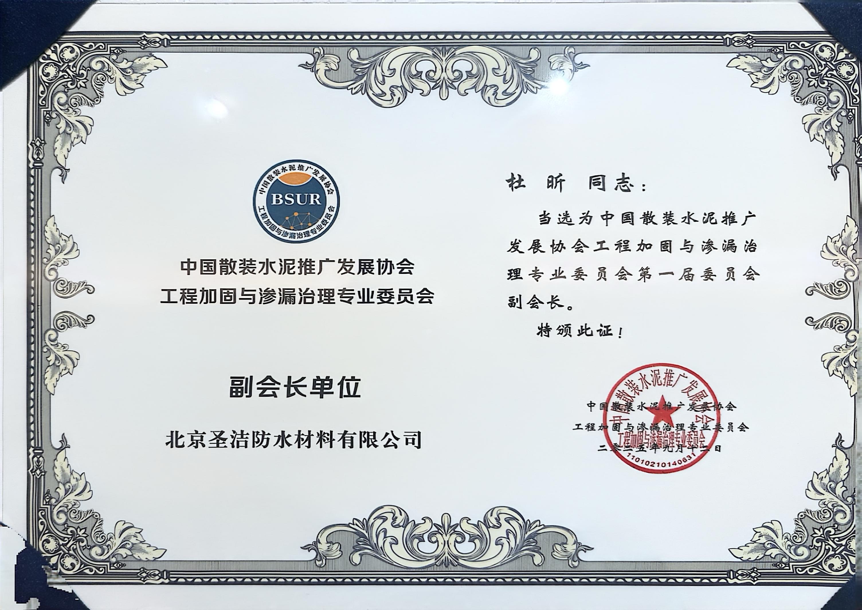 • 杜昕河北防水協會副理事長證書
